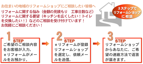 無料でリフォームに関してのご相談を受け付けています。 尚、勝手ながらあなたがお住まいのエリアが、各登録会社のサービスエリア内に該当しない場合は、ご相談のご返答ができない場合がございます。あらかじめご了承下さい。