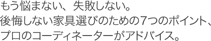 「おしゃれな部屋にしたいけど、ソファはどう選べばいいの?」 「デザインが気に入って買ったチェスト、部屋に置くと使い勝手が悪くて…」 いざ、家具を選びとなると悩みはつきもの。予算的にも大きな買い物ですから、買った後で後悔するなんて経験は、絶対にしたくないものです。 でもご安心ください。実は、家具選びには、コツがあったのです。 数多くのお客様のご相談に乗り、さまざまなノウハウを蓄積してきたスタイリクスのコーディネーターだからこそお教えできる7つのポイント。 家具選びで後悔しないために、ぜひあなたもご活用ください。